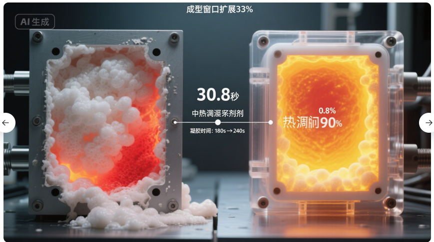 目标: 在热敏催化剂被激活前,发泡反应应已充分进行,产生足够气体使泡沫上升到预期高度。理想的时序是:发泡反应稍领先于凝胶反应,但在泡沫体积接近很大时,凝胶反应迅速增强将其固化锁定。这种“发泡-凝胶”的良好协调是获得高开孔率、防止收缩和保证泡孔结构的关键。